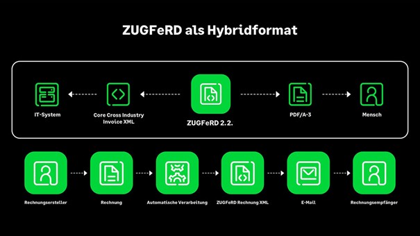 Das ZUGFeRD-Format kombiniert einen maschinenlesbaren XML-Datensatz mit einer PDF/A-3 Datei. Diese innovative hybride E-Rechnung kann sowohl von Menschen gelesen als auch ohne jegliche Medienbrüche elektronisch verarbeitet werden. Dabei ist der strukturierte Teil der Rechnung stets führend. ZUGFeRD erfüllt die Anforderungen internationaler Standardisierung und ist somit hervorragend für den europäischen und internationalen Rechnungsverkehr geeignet. Die Spezifikation wird vom Forum elektronische Rechnung Deutschland umfassend bereitgestellt.
